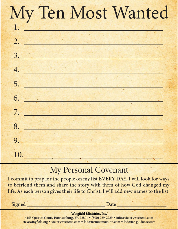 A few days ago, I came across a small card that I used to give to men that I was discipling. The title at the top of the card was “My Ten Most Wanted.” The card had ten numbered lines where we could write the names of ten Non-Christians that we wanted to see come to Christ. I found a similar card on the Internet that I inserted in the photo above.